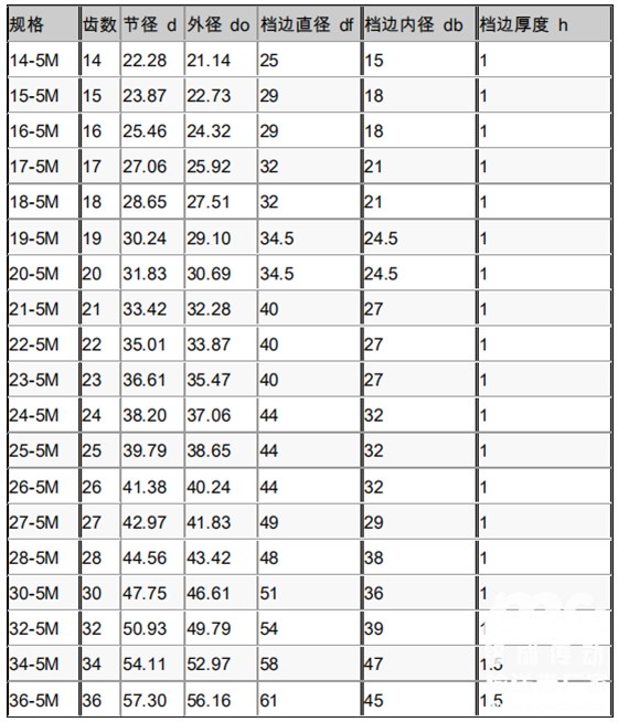 同步帶輪 的規格型號比較多,銘成為您列舉一些規格型號表格 同步帶是以鋼絲繩或玻璃纖維為強力層,外覆以聚氨酯或氯丁橡膠的環形帶,帶的內周制成齒狀,使其與齒形帶輪嚙合。同步帶傳動時,傳動比準確,對軸作用力小,結構緊湊,耐油,耐磨性好,抗老化性能好,一般使用溫度-20℃―80℃,v<50m/s,P<300kw,i<10,對于要求同步的傳動也可用于低速傳動。 同步帶傳動具有以下特點: (1)傳動準確,工作時無滑動,具有恒定的傳動比; (2)傳動平穩,具有緩沖、減振能力,噪聲低; (3)傳動效率高,可達 0.98,節能效果明顯; (4)維護保養方便,不需潤滑,維護費用低; (5)速比范圍大,一般可達 10,線速度可達 50m/s,具有較大的功率傳遞范圍,可達幾瓦到幾百千瓦; (6)可用于長距離傳動,中心距可達 10m 以上。 工業同步帶的型號: “T”型齒工業用同步帶